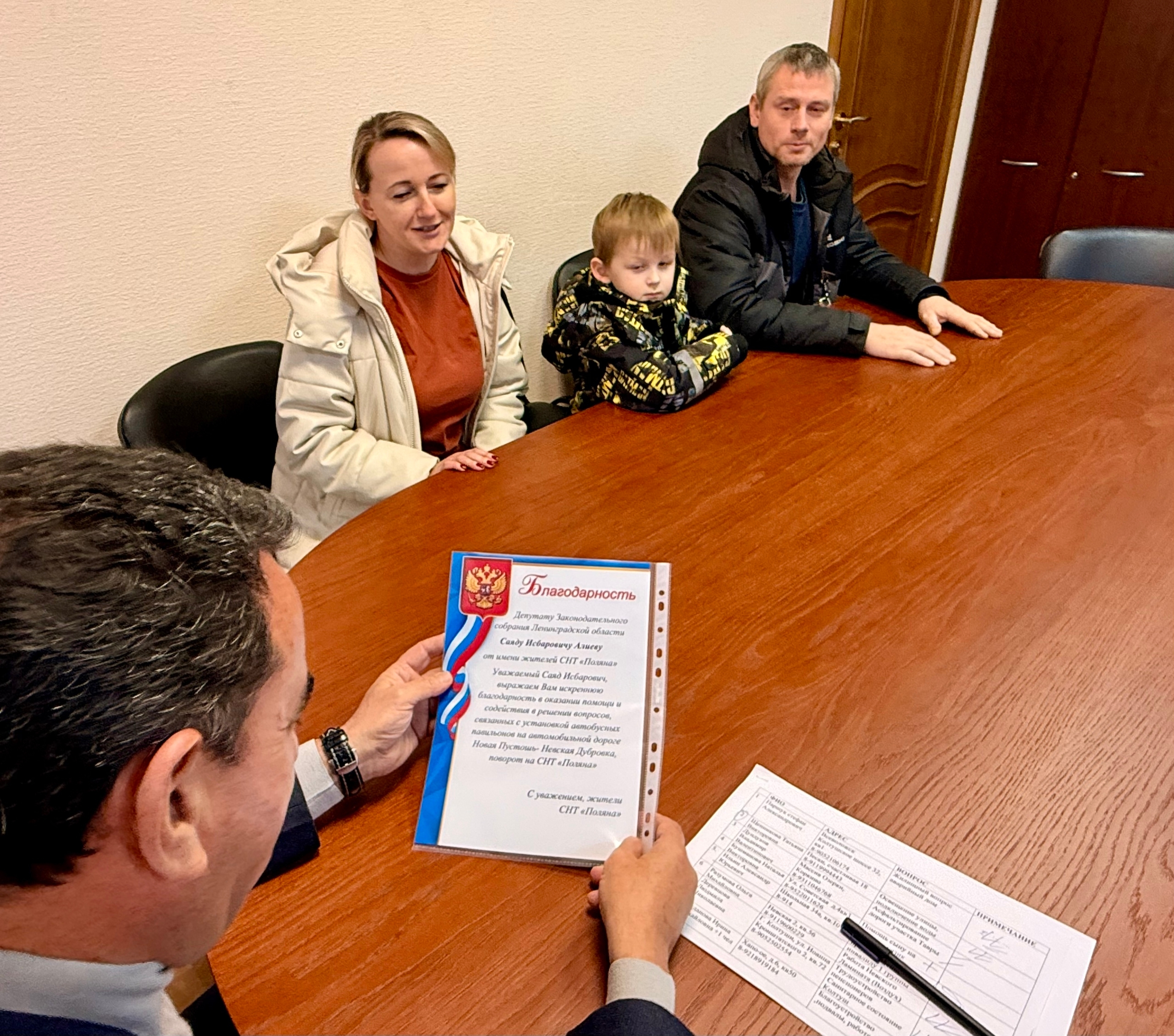 - Приятным моментом стало вручение благодарности от жителей СНТ «Поляна» за решение вопроса по установке остановочного пункта маршрутных транспортных средств.