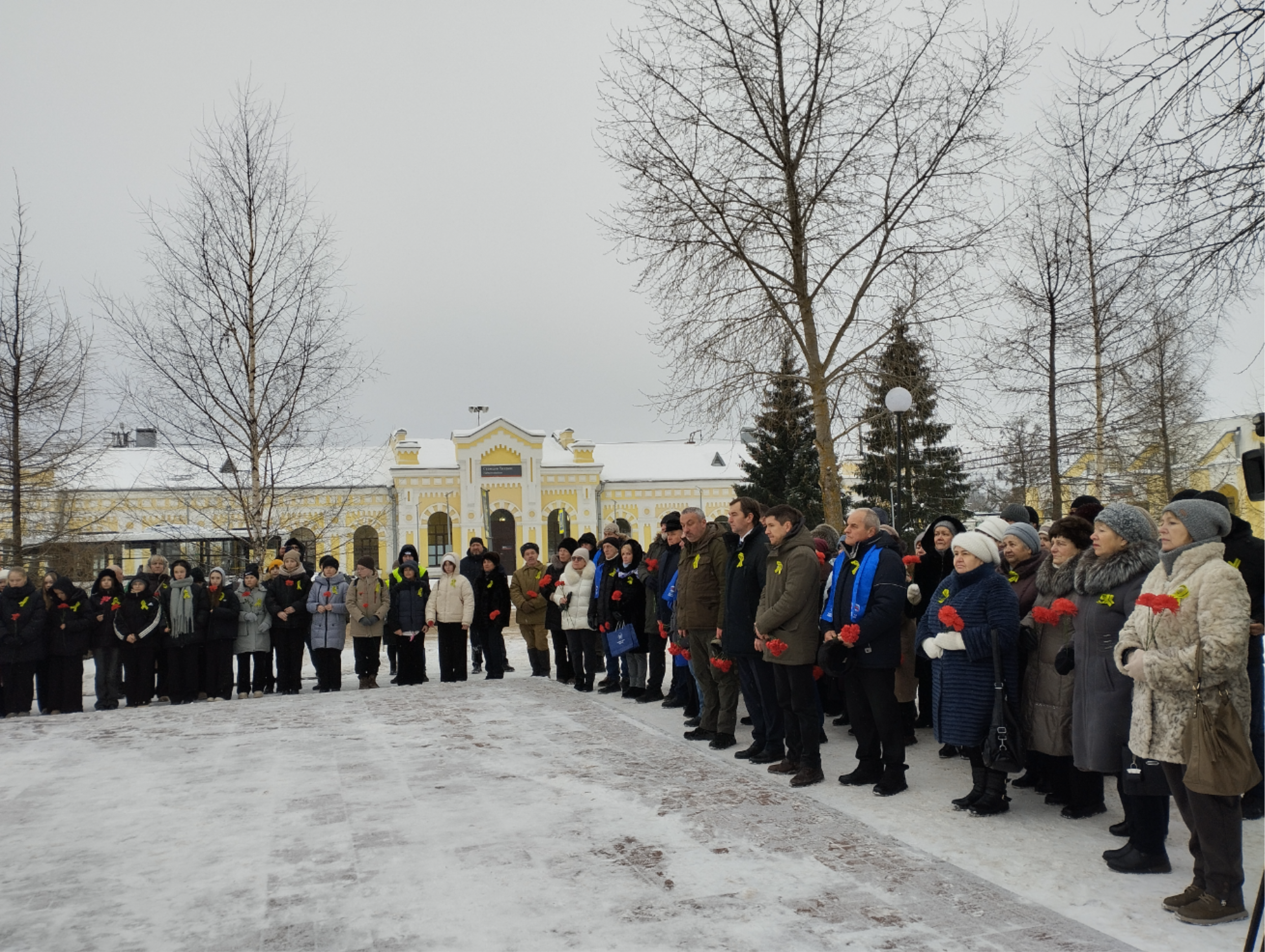 Торжественно-траурный день продолжился у Вечного огня на площади Свободы рядом с памятником «Слава героям» и на железнодорожном вокзале у памятного знака, установленного 14 октября 2016 года – в 75-летнюю годовщину трагедии на железнодорожной станции «Тихвин».