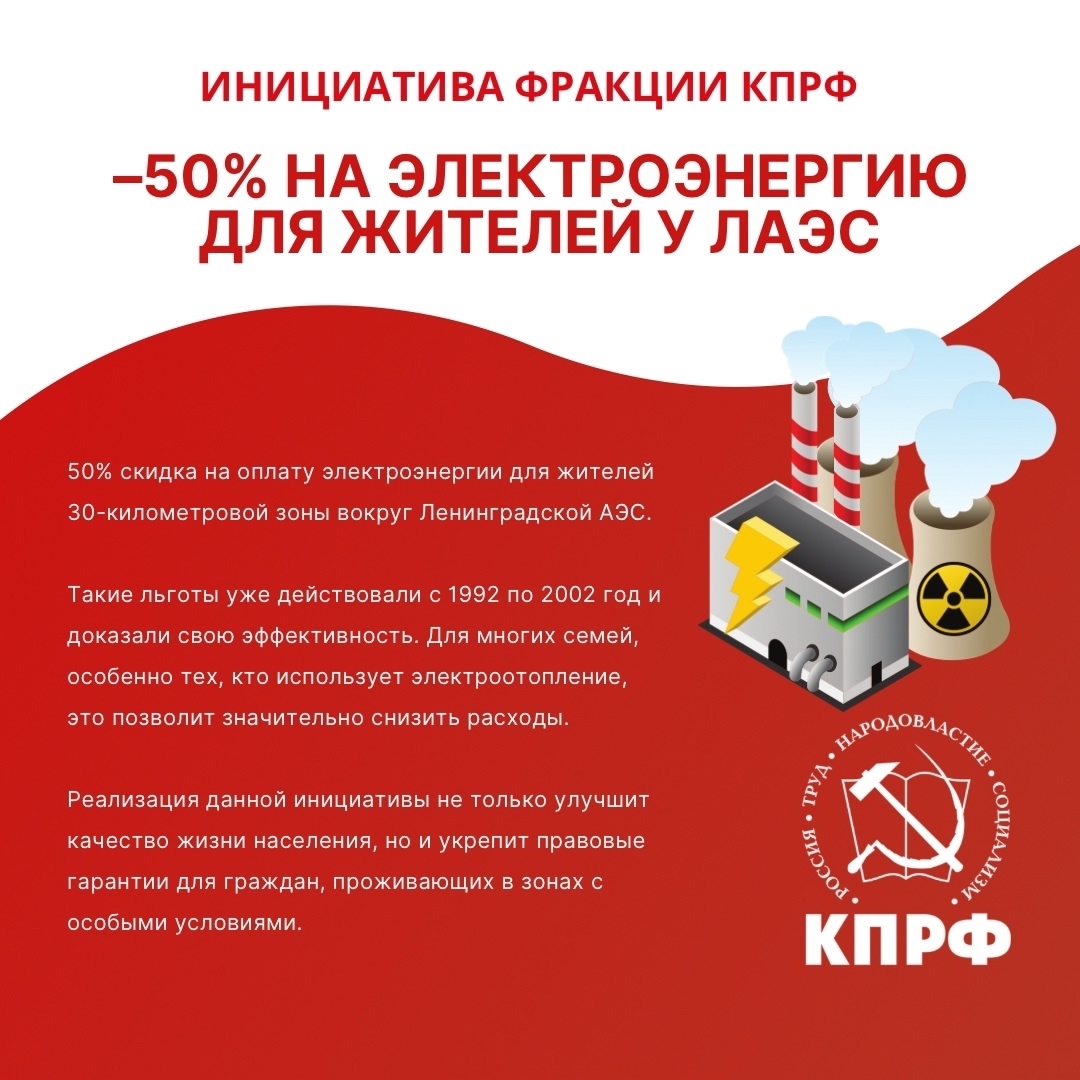 В 2021 году депутаты от фракции КПРФ предложили законопроект о льготах на электроэнергию для жителей 30-километровой зоны вокруг Ленинградской атомной электростанции. Они хотели актуализировать постановление 1992 года, учитывая современные реалии. Однако большинство депутатов проголосовали против этой инициативы.