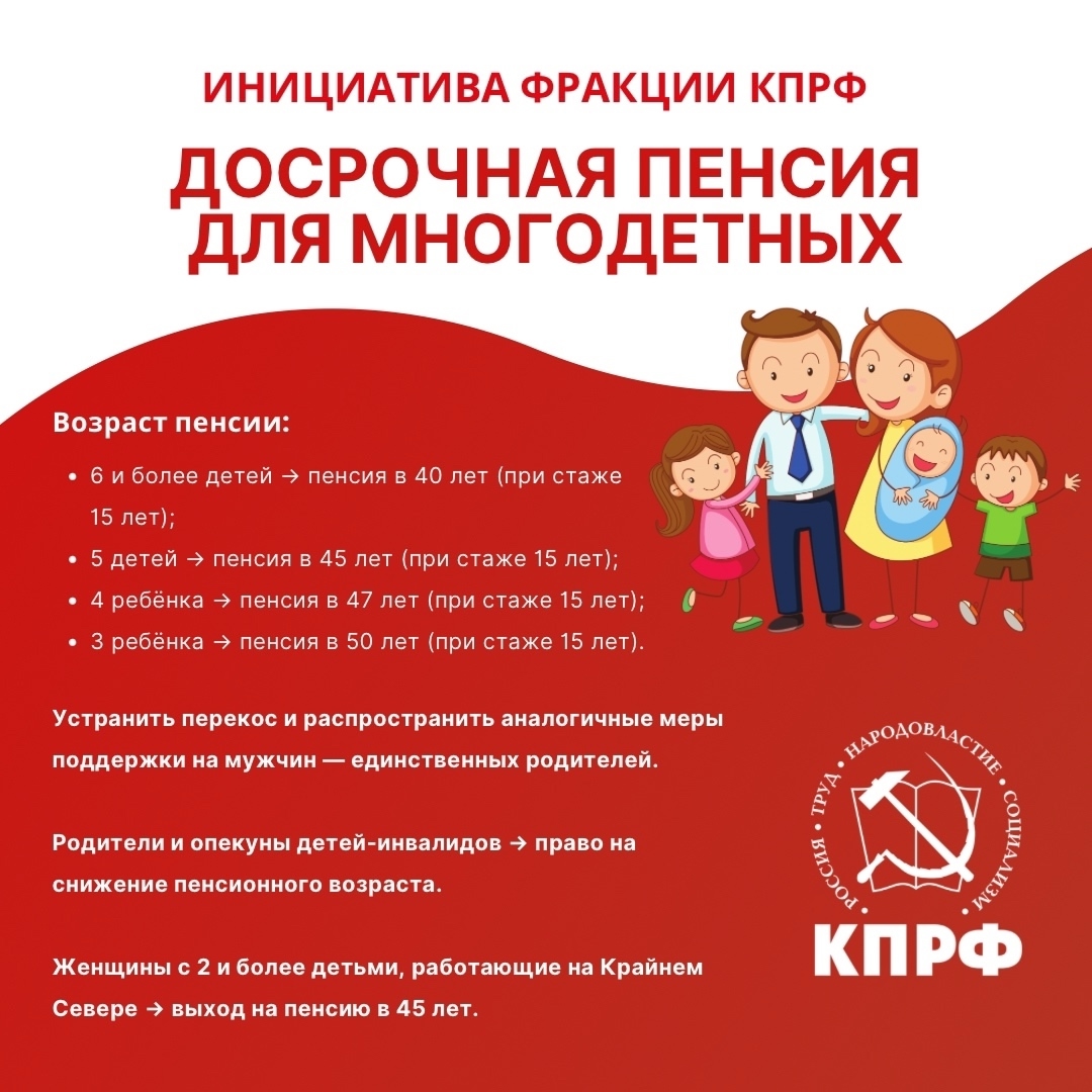 Проект поправок предусматривает установление более раннего выхода на пенсию для родителей из многодетных семей. Данная мера станет дополнительной формой социальной поддержки многодетных семей и закрепит право на досрочное назначение страховой пенсии по старости.