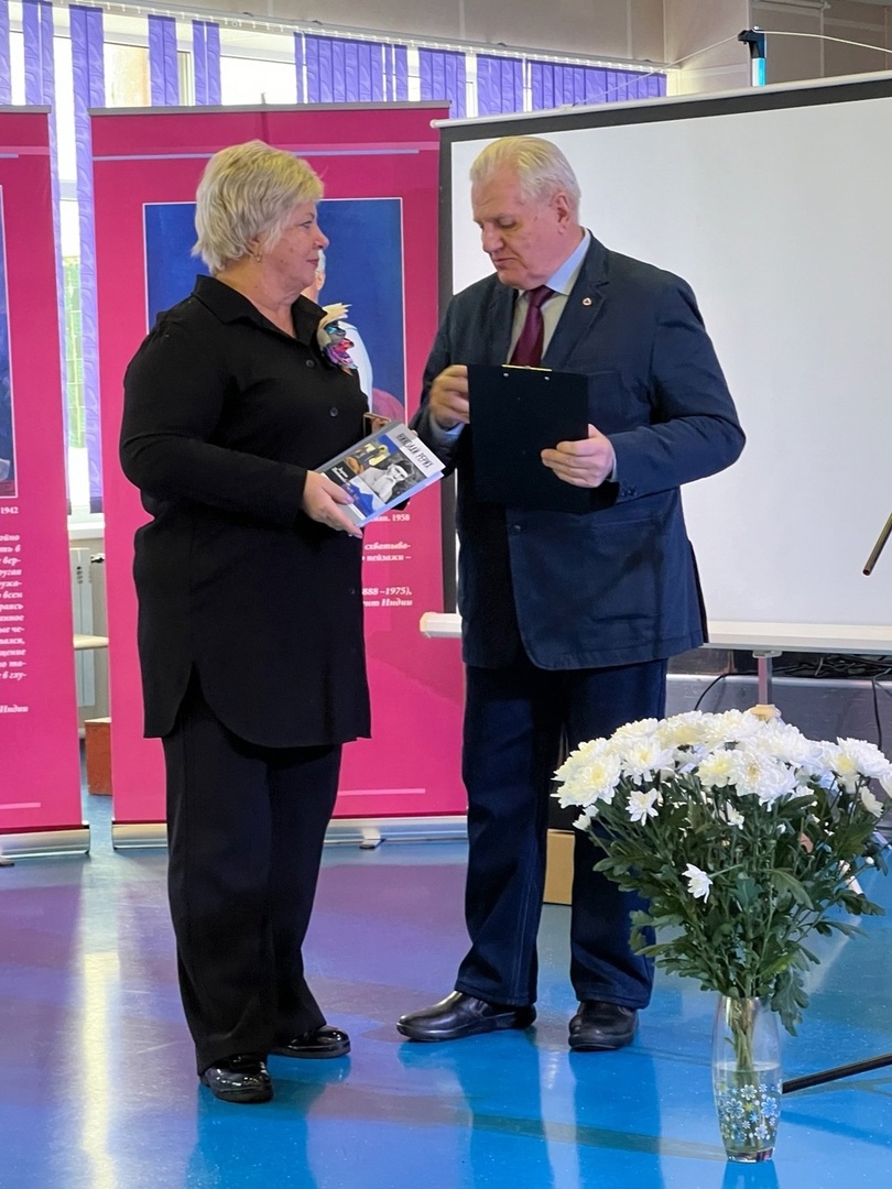 Вице-президент МЦР Александр Стеценко подарил недавно переизданную книгу Людмилы Шапошниковой о Рерихе в серии ЖЗЛ людям, кто наиболее активно популяризирует творчество семьи Рерихов в Волосовском районе. Среди них - Марина Николаевна Левченко.